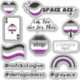 Eine Auswahl an asexuellen Aufklebern mit der schwarz-grauen und lila asexuellen Fahne, Pik-Ass, lustige Hashtags, ein Stoppschild, ein Ass Regenbogen und mehr.