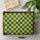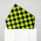 A vibrant checkerboard pattern with alternating neon yellow and black squares creates a striking geometric design, conveying a bold and energetic tone.