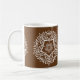 Dieses weiße Mandala sitzt auf einem dunkelbraunen Hintergrund. Die Farben sind natürlich und komfortabel. Teil der Sammlung Jarn Mandala.