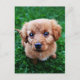Schönes Porträtbild eines Welpen, der im Gras sitzt und auf der Kamera starrt.