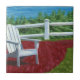 Dieses lebendige Öl-Pastell-Gemälde zeigt einen weißen Adirondack-Stuhl auf einem roten Backsteinpflaster mit Blick auf Cape Cod. Brillantes Grün, Blau, Rot und Gelb schaffen eine atemberaubende Sommerlandschaft an der Küste von New England.