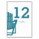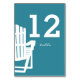Gedruckte Tischnummer-Karte mit aquamarinem adirondack Stuhl-Design, um unsere Hochzeitseinladung Set ergänzen, kann personalisiert und individuell bestellt werden.