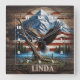 Ein Adler steht majestätisch auf einem Baumzweig neben einem ruhigen See mit Bergen im Hintergrund und einem Motiv aus amerikanischer Fahne.
