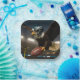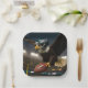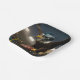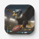 Ein kahler Adler mit einem Fußballhelm fliegt durch ein Stadion und hält einen Fußball in seinen Talonen, vor einem hellen Hintergrund mit dunklen Lampen im Stadion