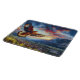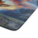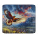 Ein schöner Adler steigt über eine noch schlafende Stadt, wenn die Sonne über den Berg steigt.