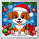 Ein niedlicher Cartoon-Welpe, der eine Weihnachtsmannmütze trägt, umgeben von festlichen Weihnachtsdekorationen und Geschenken, die perfekt zum Feiern der Feriensaison mit Freude und Fröhlichkeit sind.