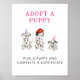 Spaß und niedliches Zeichen für die Geburtstagsfeier Ihres Kindes zum Thema Feuerwehrmann! Es ist ein Plakatzeichen der Adoption für eine Geburtstagsaktivität, um ausgestopfte Tiere adoptieren. Nehmen Sie eine Vielzahl von ausgestopften Tieren als Gastgeschenke, damit Kinder Zuhause nehmen und "ein Haustier adoptiert" können. Features Illustration von Dalmatiner Hunden mit rotem Feuerhelm und rosa Party Hüte. Im Text steht "adoptier einen Welpen".