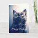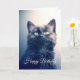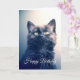 Eine einfache Geburtstagskarte mit einem hübschen, langen Haar, das mit schönen goldenen Augen aufsieht. Sein Fell ist größtenteils schwarz mit niedlichen Tabbystreifen auf seinem Gesicht.