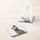 A square coaster with a white background and a gray border features a cartoon image of an Irish Wolfhound dog wearing a red Santa hat. The background is covered with the word "woof" repeated in various sizes and font styles.