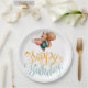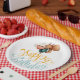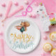Whimsical Aquarell Illustration zeigt ein bezauberndes Eichhörnchen in Overalls, das eine heiße Tasse Kaffee oder Tee trinkt. "Happy Birthday" Text in extravagantem zweifarbigem Skript-Schriftart.