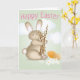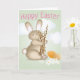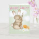 Ein zauberhaftes, flauschiges, braunes Kaninchen hält einen Ast von Pussywillow und liegt neben einigen bemalten Eiern und Molkereien.