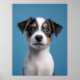 Ein fesselndes nah-up Portrait eines Jack Russell Terrier Welpen mit schwarzem, weißem und braunem Mantel, der mit großen, seelenvollen blauen Augen direkt in die Kamera schaut. Die Ohren der Welpen sind leicht aufgerissen, und ihr eigenartiger Ausdruck ist Set vor einem weichen, blauen Hintergrund, der ihre niedlichen und unschuldigen Merkmale hervorhebt.