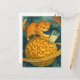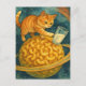 Ein niedliches Ingwer-Kätzchen schiebt ein Glas Milch von einem Planeten ab, der aus heiligen Nudeln gemacht ist und Saturn wie Ringe Fantasy Art