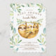 Niedliche Babydusche mit einem süßen Baby-Zwillingsschwamm mit Mama gerahmt mit natürlichen grünen Aquarellfarben-Blätter. Dreh unsere Einladung nach hinten, um ein passendes grünes Blatt für eine besondere Touch zu sehen.