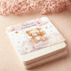 Complete your baby girl’s birthday table decor with this adorable teddy bear paper coaster! Featuring a sweet watercolor bear swinging through pink clouds and golden stars, this design includes a festive balloon and customizable name and message. With the joyful “Let’s Celebrate!” text, this coaster adds charm and coordination to your 1st birthday party theme. A perfect match to our full teddy bear birthday collection!