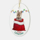 Auf der Vorderseite dieses Holiday-Ornament ist ein Bild eines niedlichen Yorkshire Terrier Hundes in einer rot-weißen Weihnachtsgeschenktüte. Hinter dem Hund befindet sich eine Reihe farbenfroher Urlaubslichter. Im Text unten steht "Frohe Weihnachten". Die Rückseite des Ornaments hat das gleiche Bild mit einem individuelle Name-Feld.