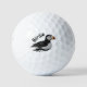 Horned Puffin Schwimmen illustriert von der Seitenansicht. Der Kopf dieses hübschen Vogels dreht sich, um seine Schnabelmarkierung zu zeigen. Der Vogel verlasse eine Wasserwelle. Über dem Vogel steht ein anpassbarer Text, der "Birdie" sagt.