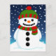 Adorable weiße Weihnachtsschneemann an einem Wintertag. Er trägt einen grünen und roten Wollhut und Schal. Seine Augen sind aus glänzenden schwarzen Kohlen gemacht und so ist sein großes glückliches Lächeln. Er hat eine orangefarbene Möhre für eine Nase und schwarze Kohleknöpfe vorne. In dieser niedlichen Winterlandschaft fallen ihm flauschige weiße Schneeflocken herum.
