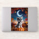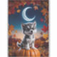 Eine charmante Halloween-Illustration, die einen bezaubernden Wolf zeigt, der unter einem Halbmond auf einem Kürbis sitzt und von Herbstblättern umgeben ist. Ideal für Tierfreunde und Halloween-Fans gleichermaßen.