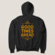 Keep warm in this stylish Adult Zip-Up Hoodie! Features "GOOD TIMES AHEAD" on the back and a small emblem on the front. Available in multiple colors. Customize it with your own text for a unique, personal touch! Perfect for casual, comfortable wear.