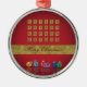 Fröhliche Weihnachtsabbildungen mit einem Adventskalender und bunten Weihnachtsbaumchen auf rotem Hintergrund.