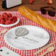 This boho chic "Adventure Awaits" boy's baby shower paper plate features a blue hot air balloon and clouds. Personalize it for your needs. You can find matching products at my store.