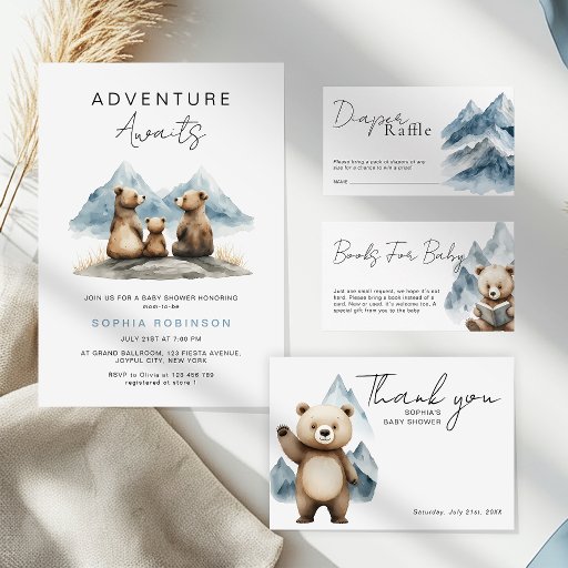 The design uses earthy greens, soft blues, and warm neutrals. Elegant script fonts highlight the phrase “Adventure Awaits.” Clean typography keeps the details clear and easy to read. This invitation suits rustic, woodland, camping, or nature-themed baby showers.