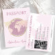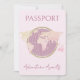 Reisemagazin Passport Baby Shower Einladung für Baby Girl mit pastellrosa Hintergrund, goldfarbener Globe-Illustration und anpassbaren Eventdetails.