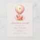 Diese niedliche Babydusche-Einladung auf der Postkarte enthält einen Teddybär in süßer Wasserfarbe, der in einem rosa gestreiften Heißluftballon mit rosa Blume um den Korb ruht, über den Worten "Abenteuer wartet!" in rosa Retro-Schrift. Personalisieren Sie den Text mit dem Namen der Mama-to-be im Skript und die Details in Sans Serif Schriftart auf einem beigen Hintergrund.