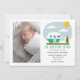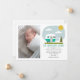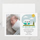 Illustration eines türkisfarbenen Campers mit Babybekleidung auf der Wäscheleine mit "The Adventure Begins" und eigenem Text für den Namen und die Geburtsdaten des Babys. Ersetzen Sie Foto durch Ihr eigenes.