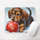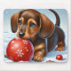 Niedliche Dackel Welpe mit einem roten Weihnachtsball in einer schneebedeckten Winterlandschaft. Freude, Unschuld und Charme der Urlaubssaison mit lebhaften Farben und fröhlicher Atmosphäre.