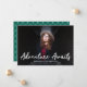 Trendy Graduation Ankündigungen mit dem horizontalen Foto des Absolventen mit "Adventure Awaits" in weißer, handgeschriebener Schrift. Personalisieren Sie die Front der Abenteuer Awartet Graduierungsankündigungen, indem Sie den Namen des Absolventen, den Namen der Schule und das Abschluss Jahr. Die Ankündigung kehrt zurück, um ein elegantes grün-weiße Trellis-Muster zu zeigen.
