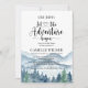 Lass das Abenteuer beginnt thematisch Aquarell Babydusche Einladung mit Wald- und Berglandschaft mit Kalligraphie Schrift Typografie mit Herz in der Mitte.