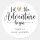 Hübsches Kalligraphieskript "lass das Abenteuer an" Babyduschaufkleber mit einem süß-rosa Herz, das die Wörter verbindet. Aufkleber Ihre Umschläge oder Gefälligkeitstaschen.