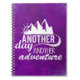 Ein Wendelheft mit einem inspirierenden Zitat, das besagt: Ein weiterer Tag ein weiteres Abenteuer. Ein Bild mit der Sonne, die hinter einigen Bergen herausschaut. Set auf lila Hintergrund.