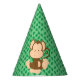 Dieser Partyhut kennzeichnet ein wiederholendes Muster des grünen Dschungel-Blätter über einem hellgrüneren Hintergrund und einem clipart eines niedlichen braunen und tan Babyaffen auf der Front.