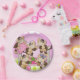 Affe-Schlummer-Partygeburtstags-Party-Papier-Teller, groß für die Schlummergeburtstags-Partyfeier oder irgendeine Art Schlummer Party oder Sleepover! Eigenschaften fünf alberne Affen an einem Schlummer-Party, ein Bett mit rosa und grüner Steppdecke, rosa Polka punktierten Kissen, Pizza und Getränke, Make-up und ein weicher rosa Hintergrund. Dieser bunte und Spaßschlummer-Party-Papier-Teller ist sicher, ein Schlag mit Mädchen alles Alters zu sein!