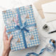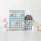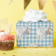 Niedlicher, grauer Elefant mit einem Affen, der an seinem Kofferraum hängt und ein blaues und cremefarbenes Gingham-Muster aufweist.