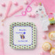 Eine quadratische Geburtstagsplatte für einen Zweijährigen, die mit der runden Version koordiniert wird. Alle Textelemente können personalisiert sein: Name, Beschriftung, Gruß. Das Design ist mit einem lächelnden Affen mit einem hellblauen Ballon versehen, der die Figur 2 darauf hat. Ein weiteres Muster von Affen auf einem hellgrünen Hintergrund schmückt den Rand der Platte.