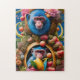 Blaue Schimpansen in einer blumigen Fantasiewelt.