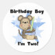 Junge T - Shirt zum 2. Geburtstag, Körperanzüge, Karten, Aufkleber, Magnete, Taschen und mehr mit einem niedlichen Jungen Affen mit einem blauen mattierten Kuchen und Text, der lautet "Birthday Boy I'm Two!".