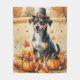 Ein Aquarellbild eines fröhlichen Hundes inmitten eines Haufen lebendiger Herbstlaub, umgeben von winzigen Kürbissen und verstreuten Eichhörnchen. Der Hund trägt einen kleinen Pilgerhut und strahlt vor Freude aus, um den Geist des Erntedanks zu erfassen. Im Hintergrund sorgen weiche Erntefelder und goldfarbene Bäume für eine friedliche Landschaft. Die sanfte Struktur und die warmen, gedämpften Herbsttöne verleihen der Szene ein gemütliches, nostalgisches Gefühl, das perfekt ist, um die Schönheit der Saison zu feiern.
