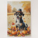 Ein Aquarellbild eines fröhlichen Hundes inmitten eines Haufen lebendiger Herbstlaub, umgeben von winzigen Kürbissen und verstreuten Eichhörnchen. Der Hund trägt einen kleinen Pilgerhut und strahlt vor Freude aus, um den Geist des Erntedanks zu erfassen. Im Hintergrund sorgen weiche Erntefelder und goldfarbene Bäume für eine friedliche Landschaft. Die sanfte Struktur und die warmen, gedämpften Herbsttöne verleihen der Szene ein gemütliches, nostalgisches Gefühl, das perfekt ist, um die Schönheit der Saison zu feiern.