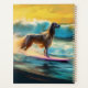 Immerse yourself in the playful world of canine adventure with this captivating painting. A spirited dog takes to the waves, skillfully riding the surf on a sun-kissed beach. The vibrant artwork beautifully captures the essence of beachside excitement as the dog fearlessly rides the waves, embodying the spirit of fun and freedom. With a harmonious blend of colors and dynamic brushstrokes, this piece brings the joy of surfing and the beach right into your space, making it a delightful addition to any art collection.