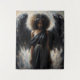 This tapestry features a slightly impressionistic artwork of a dark-skinned angel girl with black wings, her eyes cast downward. Dressed in a flowing, black Grecian-inspired gown with gold accents, she radiates quiet strength and ethereal grace. Her natural hair is crowned with a delicate gold laurel, symbolizing divine presence. The background blends moody tones of charcoal, ivory, and soft golds, creating a dramatic contrast that enhances the celestial energy of the figure.