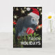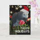 Feierliche Begrüßungen mit einem Liebesthema eines Afrikanischen Grau Papagei, der seine niedliche Weihnachtsmannmütze trägt und ein Geschenk bietet, das die Feiertagssaison mit sich bringt.