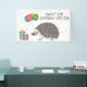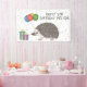 Desteis originelle Cartoon-Illustration eines niedlichen afrikanischen Pygmäen-Igel-Tieres. Der Igel wird von der Seite abgebildet und hält farbenfrohe Geburtstagsballons im Mund. Es gibt auch zwei Geschenke vor dem Igel platziert. Eine Schachtel ist lila, die andere ist aquamarin grün. Beide Geschenke sind mit einem gelben Band verpackt. Der Hintergrund hat ein Muster von bunten pastellfarbenen Konfetti auf einem weißen Hintergrund. Es gibt auch einen personalisierbaren Textbereich.