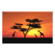Dieses Bild zeigt einen idyllischen Sonnenuntergang mit Giraffe und Regenschirm-Akazien