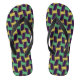 Lila und grüne Flip-Flops mit afrikanisch inspiriert geometrischen Mustern, ideal für Ausflüge am Strand.
