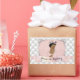 Vintages Baby in einer Krone und einer Diamanthalskette. Blütenrosa Rahmen mit Perlen und Diamanten auf einem rautengetufteten Hintergrund. Rosa Banner für Ihren Text.